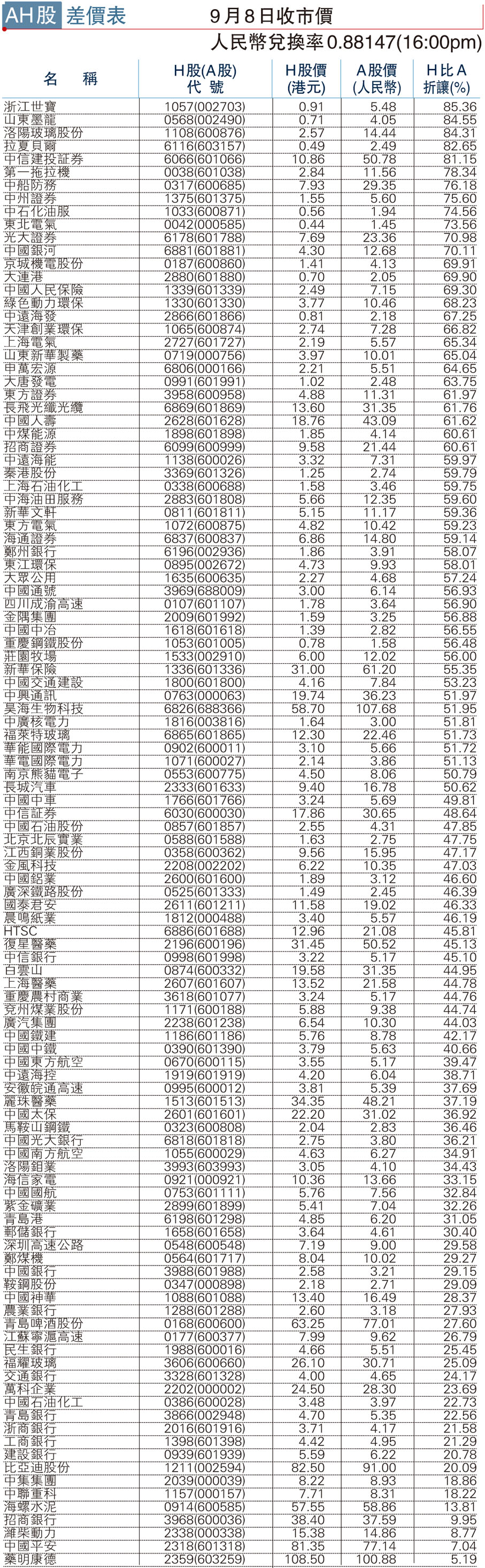 AH股差(cha)價表