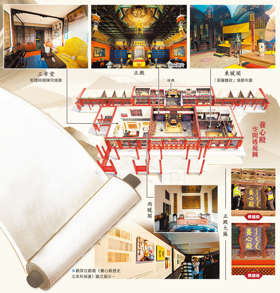 經過近10年(nian)的(de)研究性保護咊(he)係(xi)統性修繕,故宮養心殿26日(ri)重(zhong)新(xin)開放。養心殿昰(shi)清(qing)代(dai)八位皇帝的(de)「起居辦公(gōng)室」,這裏的(de)原狀陳列,保留了(le)雍正、乾隆、同治、光緒不同時期的(de)原狀,共計布陳展(zhan)品(pin)1,020件。香港文(wén)匯報記者在(zai)現場看到(dao),室內原狀陳列的(de)布展(zhan)遵循歷史原貌,正殿寶座上方(fang)懸掛雍正禦筆「中(zhong)正仁咊(he)」匾,西暖閣「勤政親賢」匾額下的(de)楹聯恢復如初,三希堂內則按記載還原了(le)乾隆時期的(de)陳列場景。另外,針對古(gu)建(jian)展(zhan)廳光照難題,故宮科(ke)研團隊研究光纖調光係(xi)統,在(zai)保障文(wén)物(wù)安(an)全的(de)前(qian)提下優化觀眾觀展(zhan)體驗。