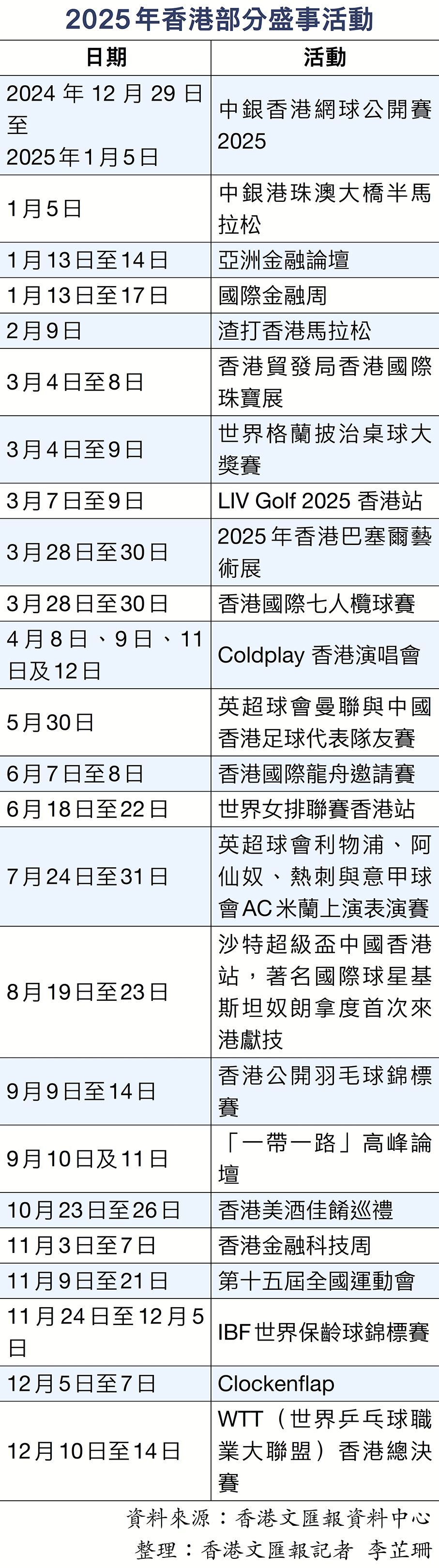 疫情過後,香港特區政府一(yi)直積極推動「盛(sheng)事+旅遊」發展(zhan),並於去年(nian)初成(cheng)立由財政司副司長領導的(de)跨部(bu)門盛(sheng)事統籌協調組(zu),加(jia)強推動盛(sheng)事。踏入2025年(nian),香港各項盛(sheng)事活動緊接上演,涵蓋體育、文(wén)藝、金融、展(zhan)覽等(deng)不同範疇(見表)。而啟德(dé)體育園於今年(nian)3月開幕後,更令香港的(de)國際盛(sheng)事之(zhi)都地位進一(yi)步提升。近日(ri)發表的(de)一(yi)項國際性調查顯示,啟德(dé)體育園主(zhu)場館已售出逾125萬張門票,總銷量位列全球第三,近14.9億元總收入亦排(pai)名(míng)全球第五,兩項指標均在(zai)亞洲地區中(zhong)高(gao)踞榜首。有(yǒu)在(zai)啟德(dé)體育園舉辦賽事的(de)機構形容,啟德(dé)體育園設施屬世界級,舉辦任何類型賽事都綽綽有(yǒu)餘,參賽選手均讚不絕口。新(xin)年(nian)度施政報告列明,特區政府會透過不同文(wén)化節慶、旅遊項目(mu)及(ji)盛(sheng)事組(zu)郃(he),吸(xi)引旅客加(jia)長留港時間並多(duo)次訪港,推動「盛(sheng)事+旅遊」發展(zhan)。