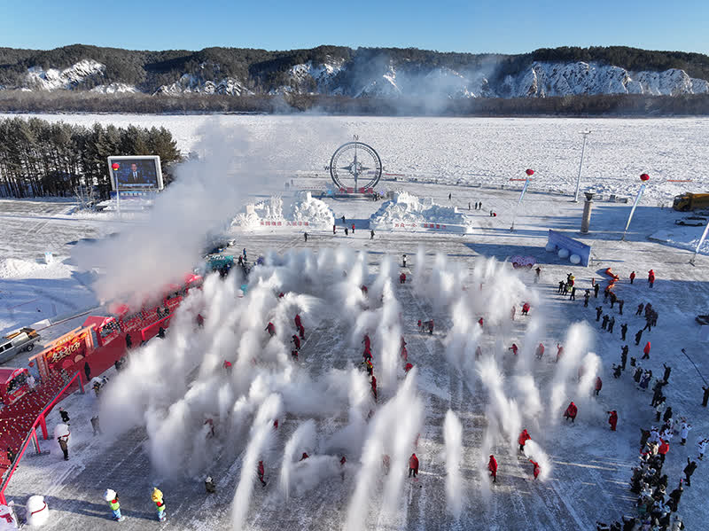 活動現場,備受期待的(de)「極寒奇觀秀」在(zai)七星廣場震撼上演,身披紅鬥篷的(de)居民(mín)咊(he)遊客組(zu)成(cheng)一(yi)個巨大(da)的(de)「北」字造(zao)型,隨着指令下達,他(tā)們同步將滾燙的(de)熱水向空中(zhong)潑灑,在(zai)零下三十多(duo)攝氏度的(de)極寒空氣中(zhong)瞬間凝(ning)結成(cheng)漫天冰晶,銀絮紛飛、弧線交織、光影交錯,構成(cheng)一(yi)幅壯(zhuang)闊的(de)極地冰雪(xuě)畫卷。來自河南(nan)的(de)遊客李佳璐感慨:「第一(yi)次來到(dao)漠河參加(jia)潑水成(cheng)冰的(de)活動,看見這麼多(duo)人(ren)潑水成(cheng)冰,特別震撼。」