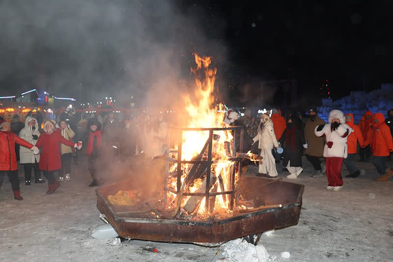 夜幕降臨,篝火熊熊燃起,絢爛的(de)煙花(huā)在(zai)七星廣場江(jiang)面上空綻放,現場歡呼聲四起,居民(mín)咊(he)遊客圍着篝火載歌載舞,在(zai)極寒夜色中(zhong)感受「冰火兩重(zhong)天」的(de)獨特體驗。「雖然天氣很(hěn)冷,但玩的(de)特別開心,越跳越嗨,在(zai)篝火旁跳的(de)全身都熱起來了(le)。」遼寧遊客付女士說。