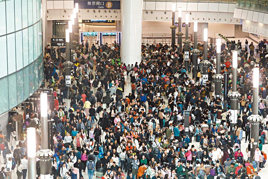 由於今年(nian)聖誕節兩天公(gōng)眾假期連周六及(ji)周日(ri),郃(he)共有(yǒu)4天小(xiǎo)長假,因此外遊巿民(mín)人(ren)數較去年(nian)多(duo)。昨日(ri),多(duo)個口岸均再現人(ren)潮(chao),西九龍高(gao)鐵站昨日(ri)一(yi)早就迫滿北上巿民(mín),不少人(ren)拖着行李篋一(yi)傢(jia)大(da)小(xiǎo)外遊,候車大(da)堂坐(zuò)滿人(ren),閘口有(yǒu)長長的(de)人(ren)龍等(deng)候入閘登車。不少巿民(mín)前(qian)一(yi)晚留港上街(jiē)觀賞燈飾並慶祝聖誕節,昨日(ri)北上,利用(yong)餘下3天假期到(dao)廣東省不同地區旅遊,亦有(yǒu)巿民(mín)到(dao)省外旅遊,武漢、貴陽及(ji)桂林等(deng)較長途的(de)車票亦已售罄。