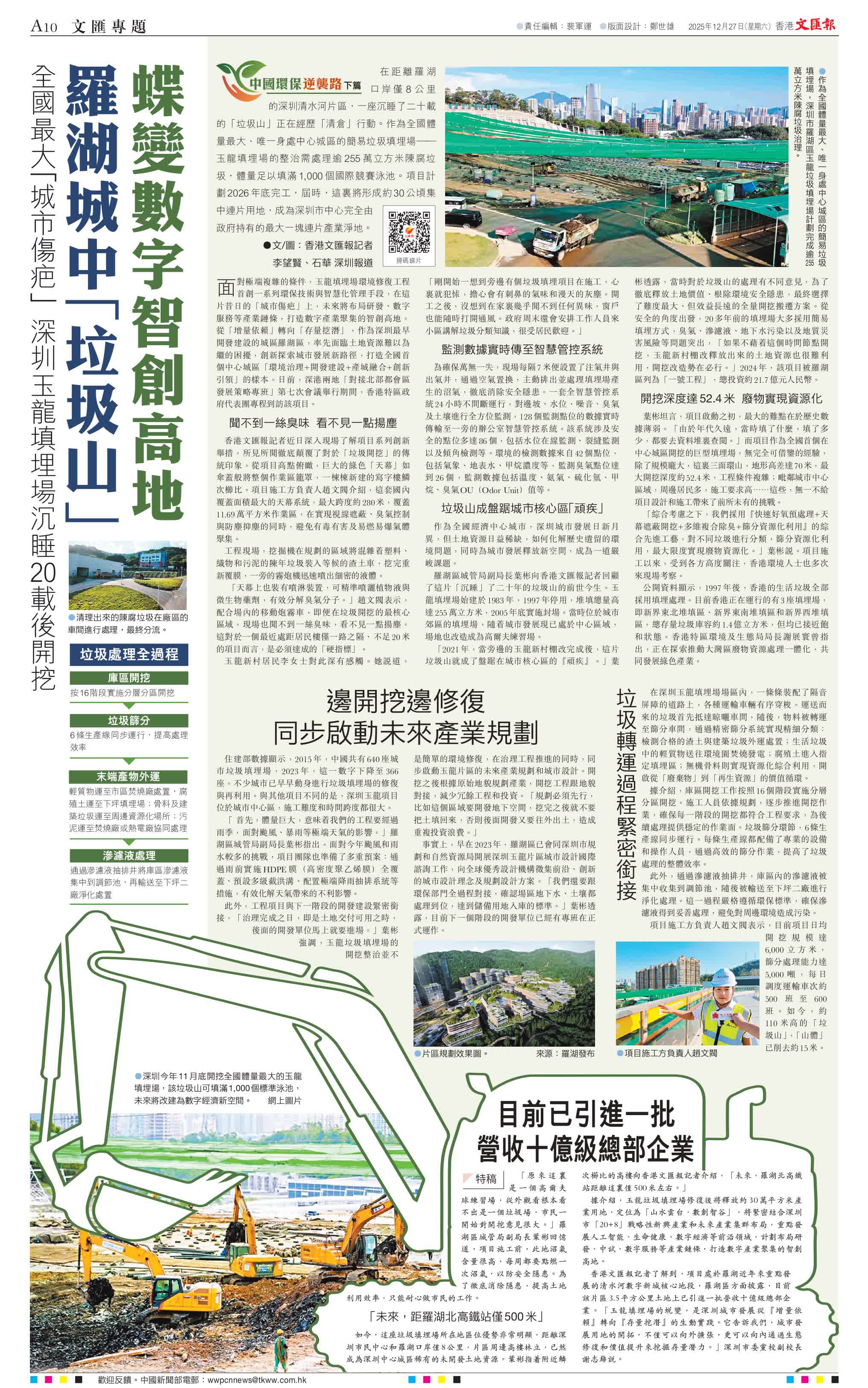 香港文(wén)匯報訊(記者李望賢、石華 深圳報道)在(zai)距離羅湖(hú)口岸僅8公(gōng)裏的(de)深圳清(qing)水河片區,一(yi)座沉睡了(le)二十載的(de)「垃圾山(shān)」正在(zai)經歷「清(qing)倉」行動。作(zuò)為全國體量最大(da)、唯一(yi)身處中(zhong)心城(cheng)區的(de)簡易垃圾填埋場——玉龍填埋場的(de)整治需處理(li)逾255萬立方(fang)米陳腐垃圾,體量足以(yi)填滿1,000個國際競賽泳池。項目(mu)計劃2026年(nian)底完工(gong),屆時,這裏將形成(cheng)約30公(gōng)頃集(ji)中(zhong)連片用(yong)地,成(cheng)為深圳市(shi)中(zhong)心完全由政府持有(yǒu)的(de)最大(da)一(yi)塊連片產業淨地。